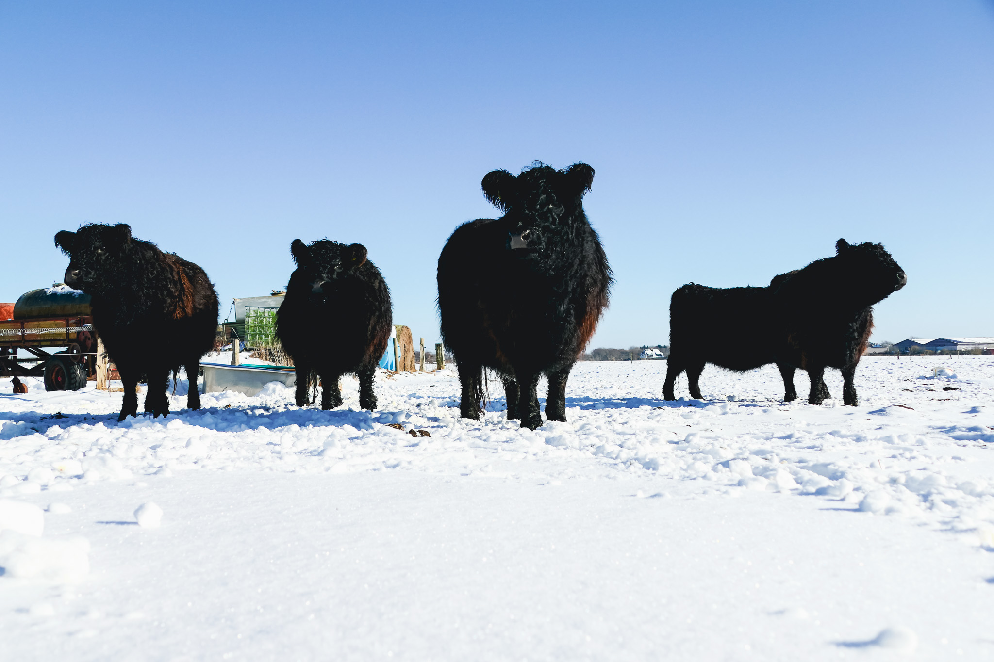 Wie eng auch Insulaner Bleicke Andersen mit der Sylter Landschaft verwoben ist, wird an jenem Mittwochnachmittag deutlich. Bei strahlendem Sonnenschein fährt er vom Hof der Sylter Landschlachterei in Keitum mit dem Traktor gen Westen zu einer schneebedeckten Wiese. Dort überwintert derzeit die Galloway-Herde der Familie Andersen, bis die überfluteten Salzwiesen wieder trocken genug sind. Ihnen verdankt die Herdbuchzucht auch ihren Namen: „Von Sylter Salzwiesen“, deren Wurzeln in Shankend Farm Cottage, Hawick, Roxburghshire im Südwesten Schottlands liegen.