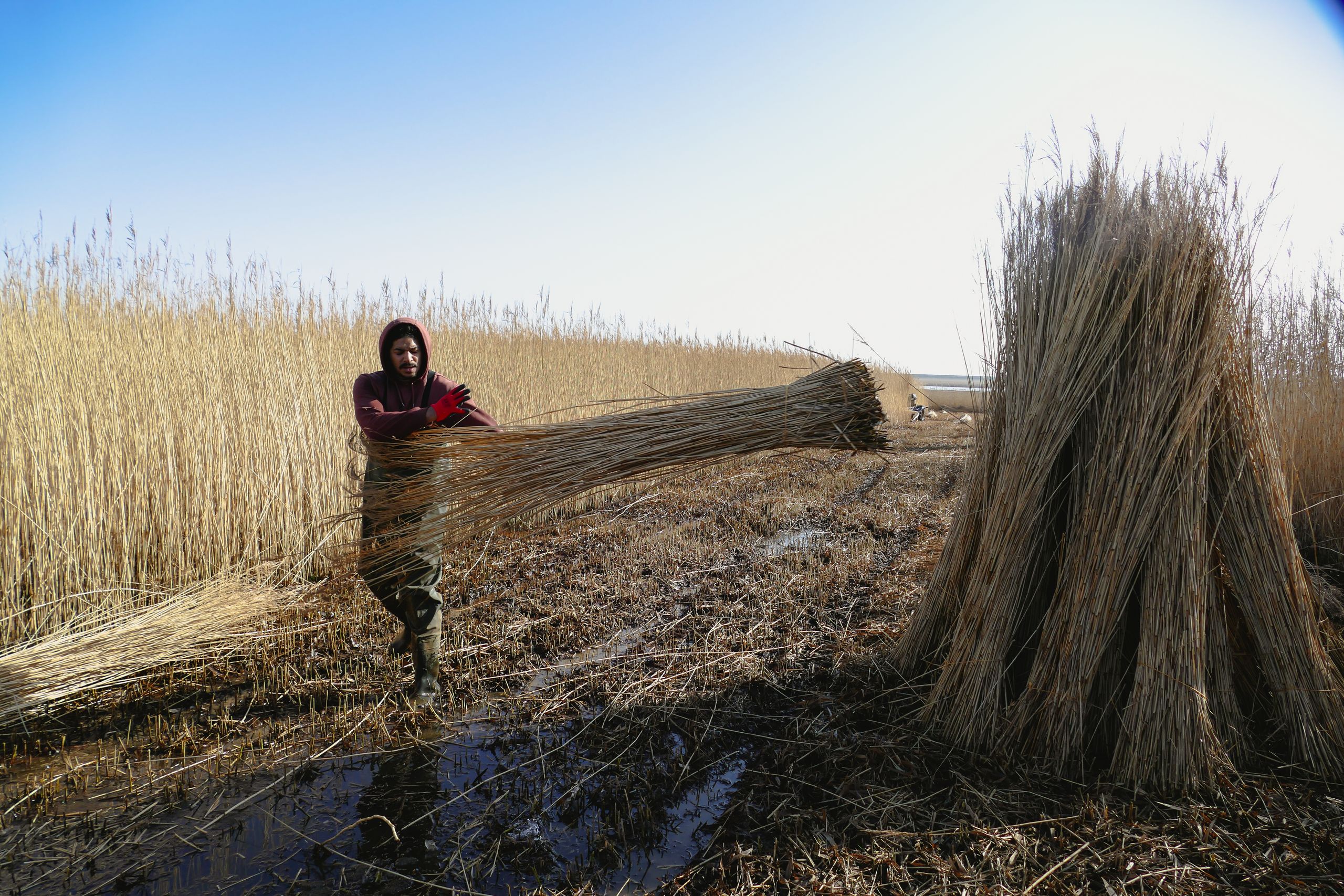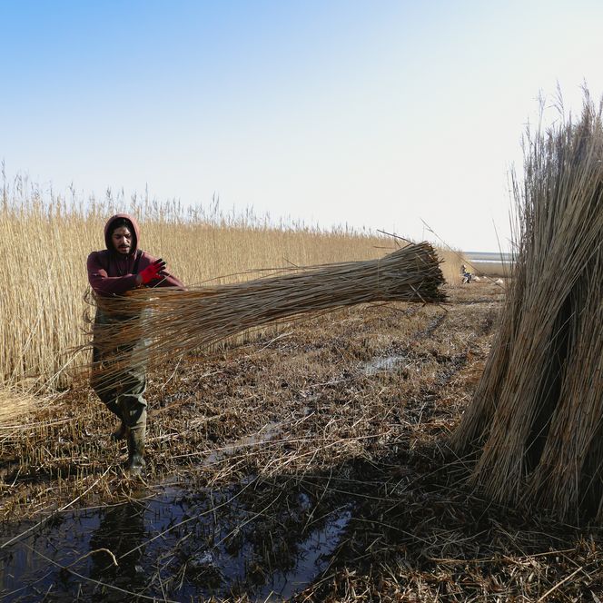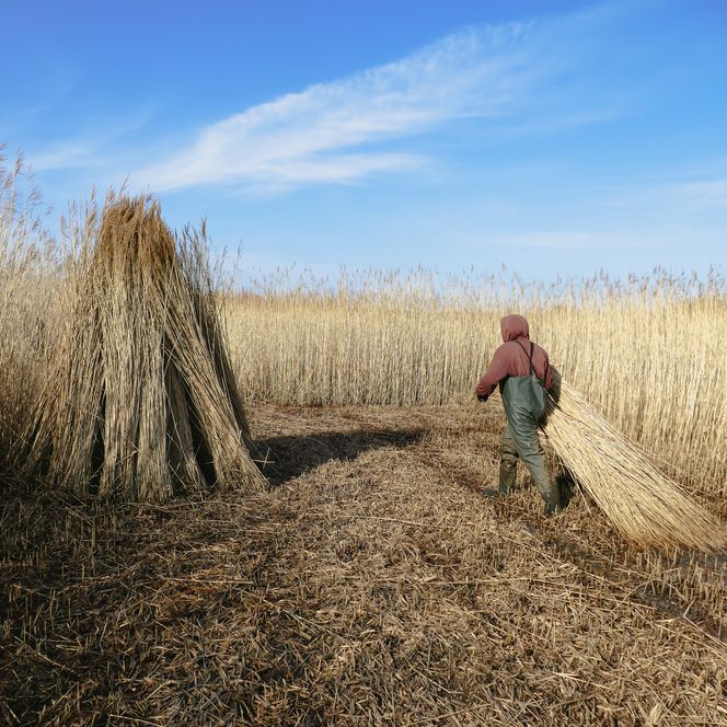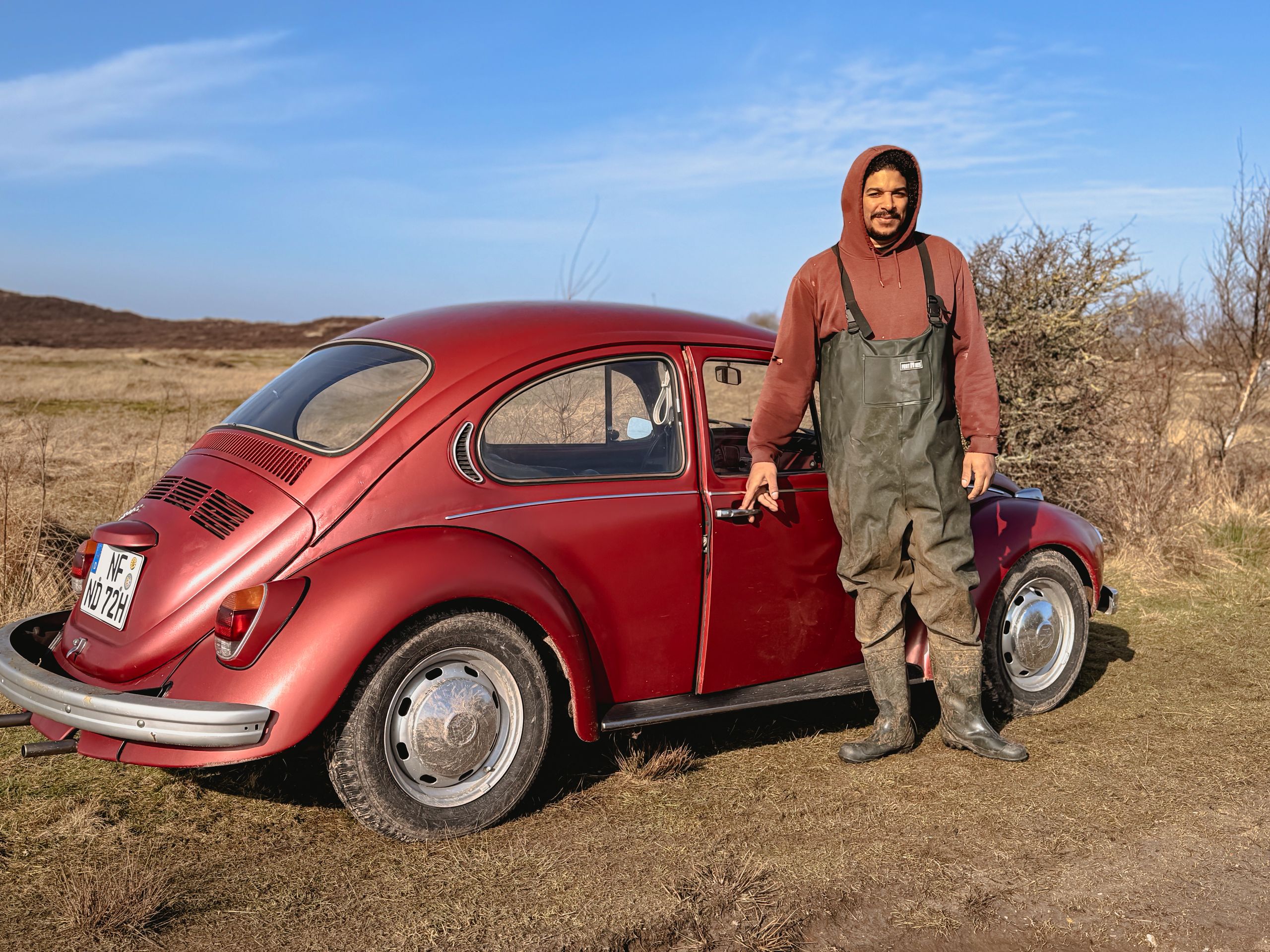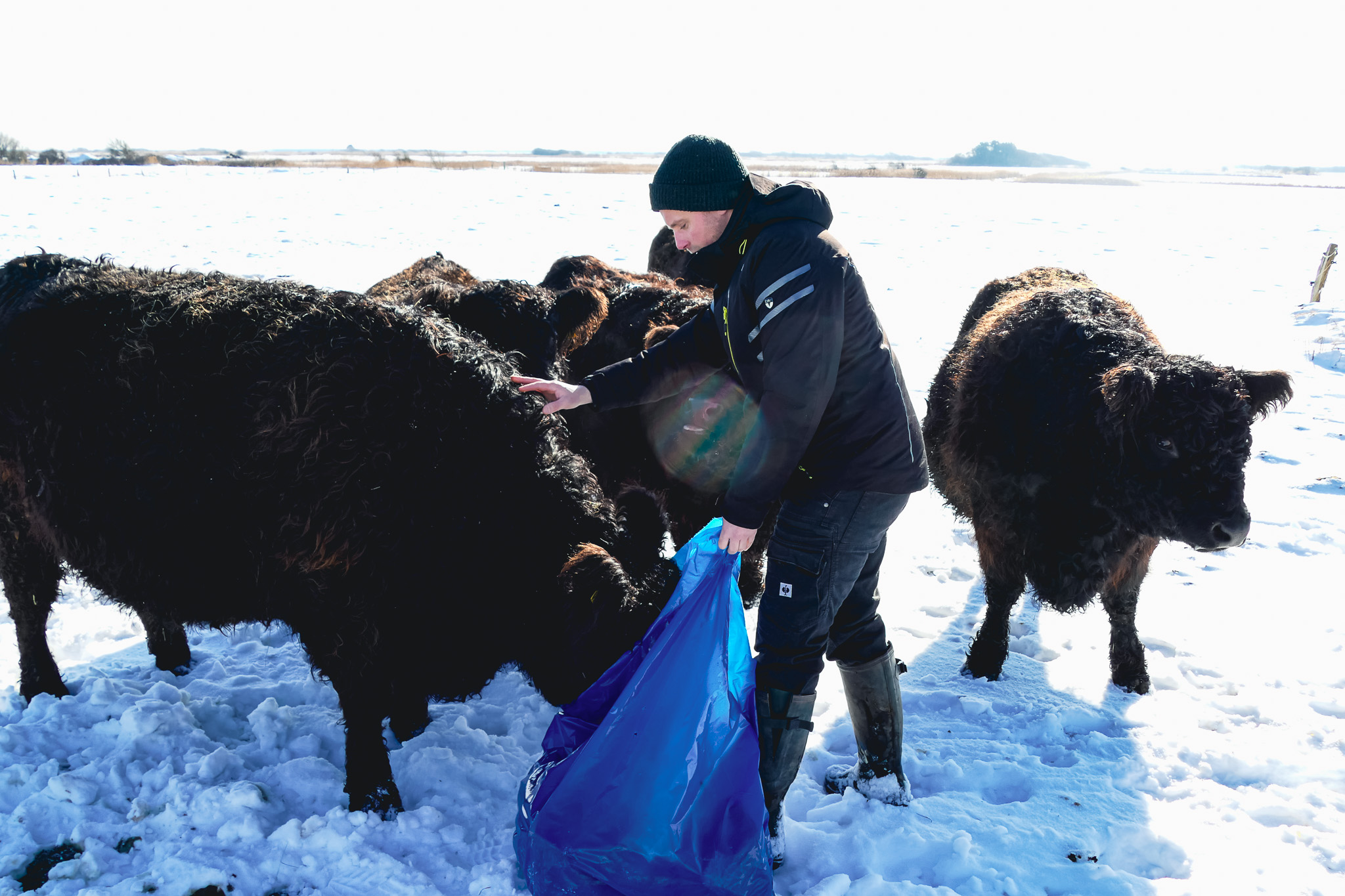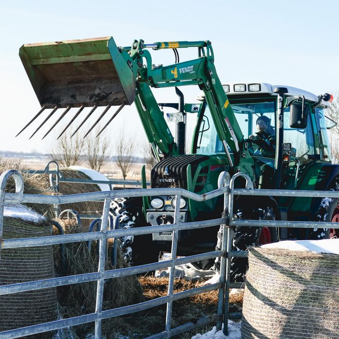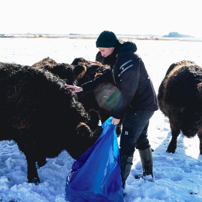 „Wir achten darauf, dass unsere Tiere trockenen Boden unter den Klauen haben und sich vor dem Wind schützen können“, erzählt Bleicke und krault dabei einer Mutterkuh liebevoll den Rücken. Sie genießt die Aufmerksamkeit sichtlich, ebenso wie die trockenen Brötchen, die er heute in einem blauen Sack mitgebracht hat. Inzwischen hat sich die gesamte Herde dicht um ihn versammelt. Doch von Angst oder Hektik keine Spur. Bleicke bleibt ruhig und geerdet. Er kennt seine Tiere genau und weiß, wie er sich zwischen ihnen bewegt.