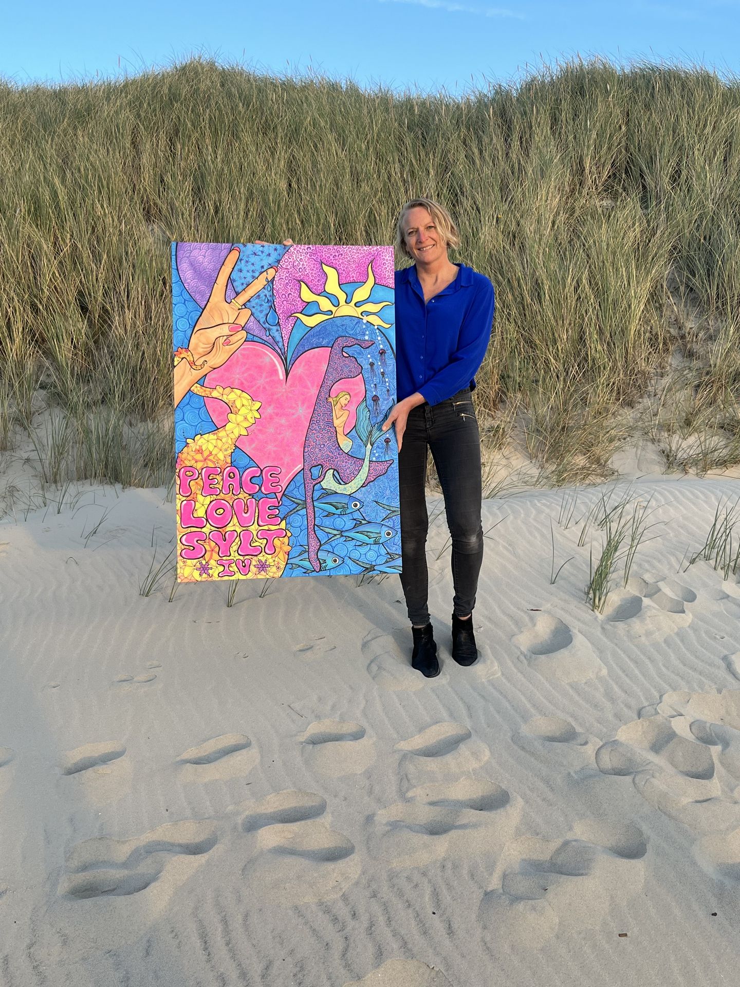 Sonni Hönscheid ist 12-fache Deutsche Meisterin im Wellenreiten und 7-fache Weltmeisterin im Stand-Up-Paddeln. Neben ihrer internationalen Surfkarriere hat sie sich mit ihrer farbenfrohen Kunst einen Namen gemacht. Bereits mit den ersten drei Ausstellungen der Reihe „PEACE LOVE SYLT“ im Kaamp-Hüs begeisterte sie zahlreiche Besucher.