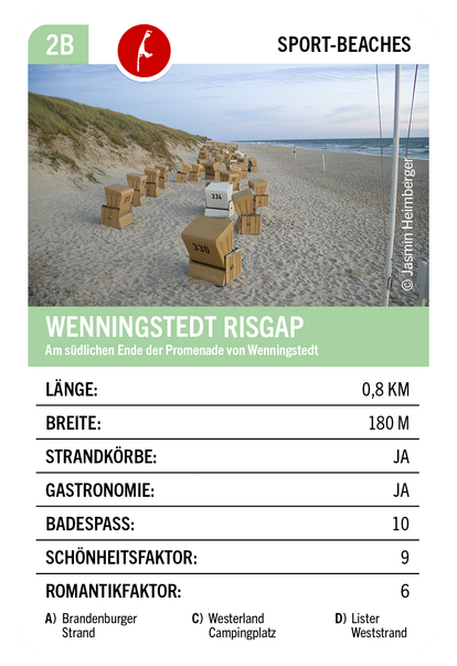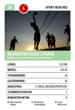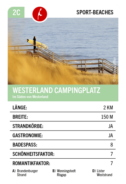 Am nördlichen Ende der Westerländer Strandpromenade. Der Klassiker für Wellenreiten, Kiten und Windsurfen. Hier gibt es eine traditionsreiche Surfschule und den „Surf Club Sylt“ für die Locals. Außerdem ist hier der „Funbeach“ mit Musik, Animation, diversen Beachsportarten und schönen Begegnungen. Für passive Sportler auch superspannend, weil hier im Sommerhalbjahr die tollsten deutschen und internationalen Wettbewerbe ausgetragen werden. Gastronomie gibt’s hier natürlich auch in aller Form. Joker-Faktor: Kurzer Weg zum Strand - auch für Menschen mit Handicap geeignet.