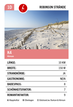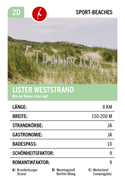 Nirgendwo völlig glamourös, aber eben total „underrated“. Entlang des acht Kilometer langen Lister Weststrandes gibt es eigentlich alles, was der Beachgänger wünschen könnte. Eine Sauna, Netze für Soccer und Volleyball, einen Jugendstrand im Norden, FKK-Bereiche und zwischendurch wieder völlige Ruhe. Ein Alleskönner in schönster Umgebung. Joker-Faktor: Kultfigur-Manfred sorgt seit Jahrtausenden für sportliche Animation.