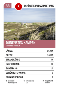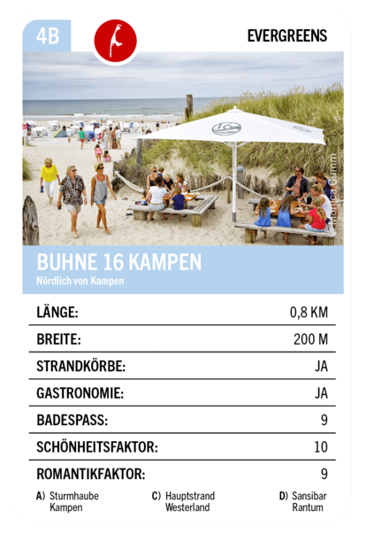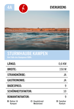 Parkplatz, auch für viele Räder, kurzer Weg - Strand. Am Fuße des Kampener Roten Kliffs, mit dem Haus „Kliffende“ als Kulisse, Yoga-Sessions am Morgen und meganettes Personal - das ist der Kampener „Sturmhauben-Strand“. Ach ja, im gleichnamigen Gastro-Flaggschiff kann man auch nächtigen und selbstgebrautes Bier trinken. Joker-Faktor: Händchenhalten auf dem Holzpodest.