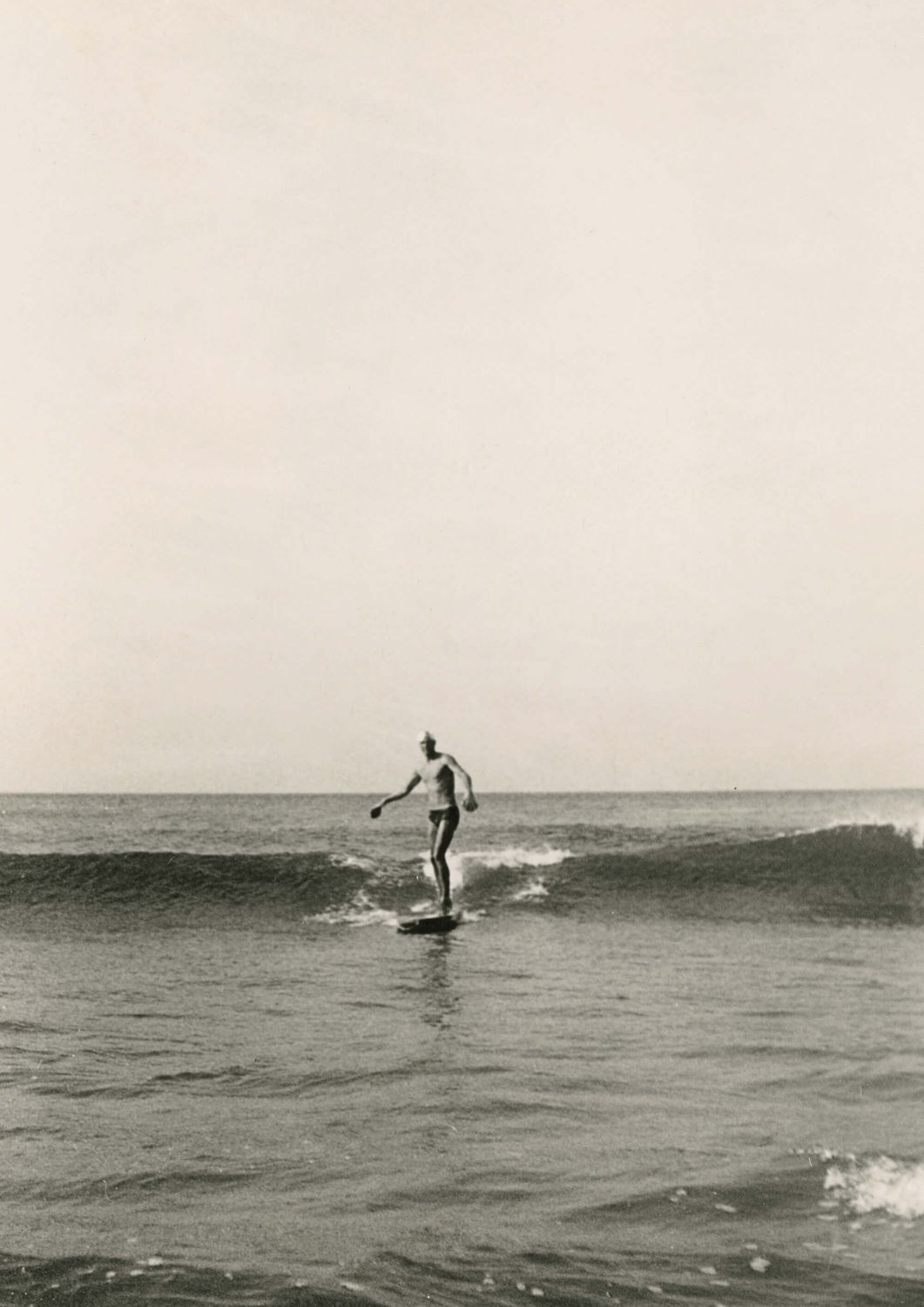 Der eigentliche Anfang der Surferei war ja schon im 12. Jahrhundert - das belegt Höhlenmalerei in Polynesien. Dann kam das Ganze im 18. Jahrhundert nach Hawaii, fand aber erst viel später Verbreitung an allen Küsten. Wir auf Sylt steigen dann erst 1952 ein. Noch bevor Sylter wie die Behrens-Brüder oder Jürgen Hönscheid die ersten richtigen Bretter aus Biarritz und den USA nach Sylt exportierten und später ihre Boards auch selbst bauten, hatten wir halt Rettungsschwimmer Uwe Drath, der im Sommer 1952 mit seinen eigenen Worten „einem Kurschatten auf der Promenade schöne Augen machen wollte“. Er schnappte sich sein ewig langes Rettungsbrett ohne Finne, Leash oder einer konkreten Vorstellung von dem, was er da vorhatte, paddelte raus, bekam eine Welle und surfte ans Ufer. Das und alles, was danach geschah, erlebt ihr in der Ausstellung.