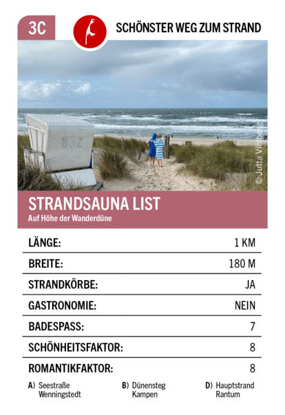 Jede Dünenformation hat ihre Qualität. Der Weg vom Parkplatz zur Lister Strandsauna ist besonders beeindruckend, gerade auch auf dem Rückweg - mit den Wanderdünen als ferner Kulisse. Dieser Weg ist Entschleunigung durch und durch - insbesondere wenn man den Tag dann in der Strandsauna verbringt. Joker-Faktor: Ideal für lauffreudige Romantiker.