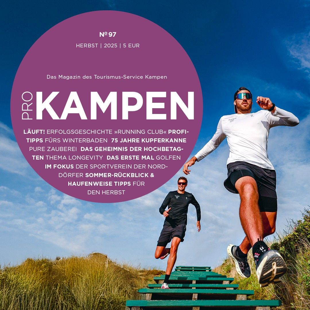 Die schönsten Seiten von Kampen präsentiert vier Mal jährlich PRO KAMPEN, herausgegeben vom Tourismus-Service Kampen. Mit News, Reportagen und vielen Infos aus dem Dorf. Als Heilmittel gegen Heimweh nach der Nordsee, als Appetitanreger vor dem Urlaub, als Entertainer und Informant vor Ort, als Nachlese der schönsten Wochen des Jahres. Bleib mit diesem Magazin immer auf dem Laufenden und erfahre, was in und um Kampen passiert - digital von zuhause aus oder in gedruckter Variante auf der Insel.
