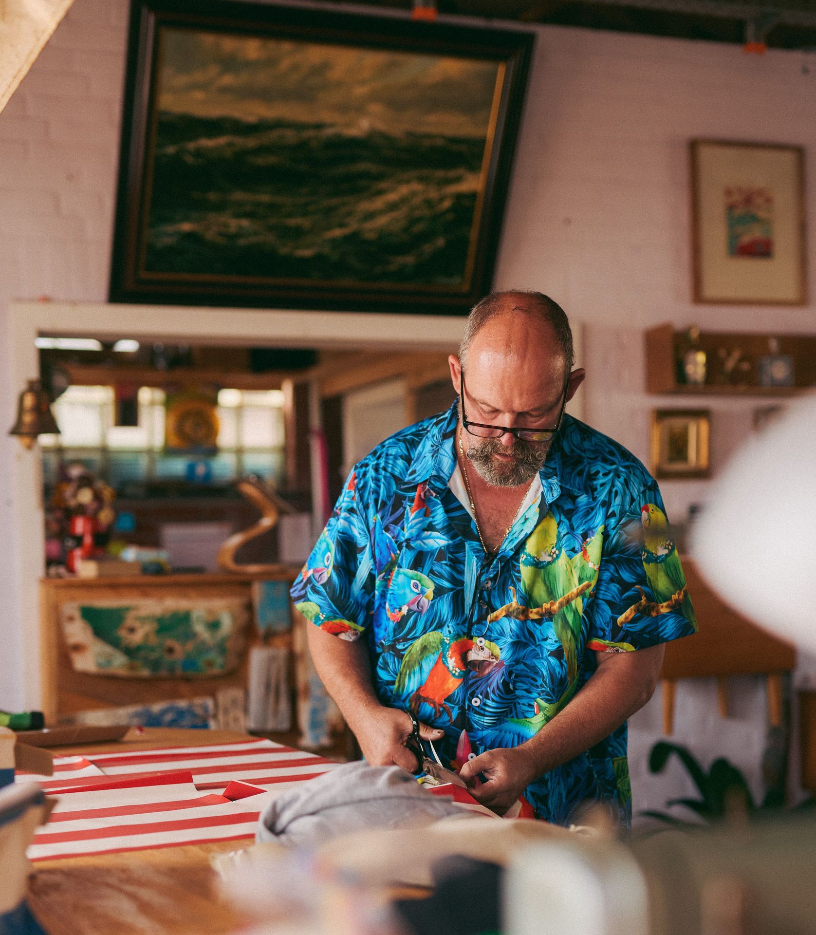 Direkt an der Düne, mit der Brandung in Hörweite, liegt das Surfhouse auf dem Campingplatz im Westerländer Süden. Hier, wo sonst Sonnenanbeter und Surfer den Sommer genießen, herrscht nun kreative Ruhe und nordische Gemütlichkeit: Zeit für den Näh-Workshop der SMG-Veranstaltungsreihe „Sylter Sturmwoche“. Der Workshop lädt dazu ein, das raue Erbe des Meeres auf neue Weise zu erleben. Vor den Teilnehmern stapeln sich Stoffe und Materialien, darunter vom Sturm gezeichnete Fragmente der legendären Sylter Strandkörbe. Diese blau-weißen und sandfarbenen Symbole des Strandlebens, vom Nordseewind gezeichnet, sollen nun eine neue Form finden.